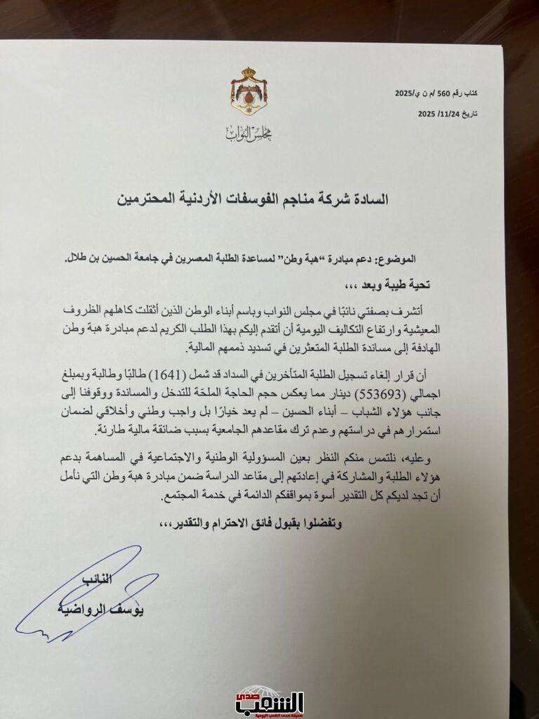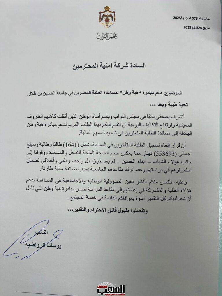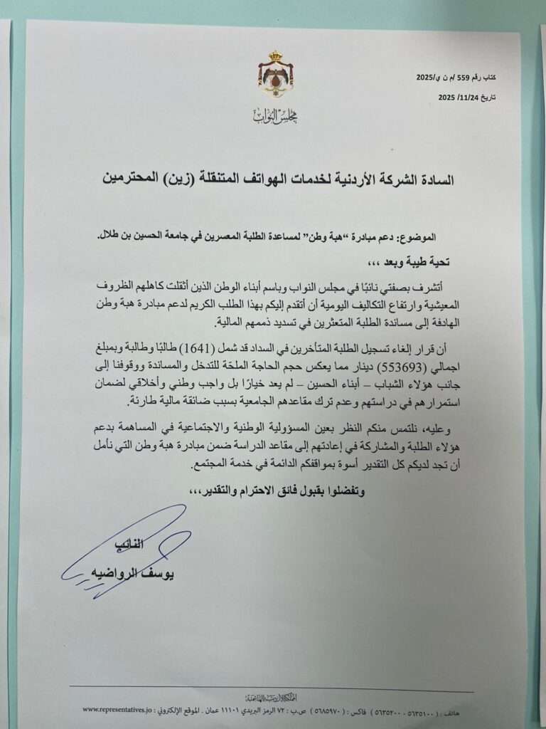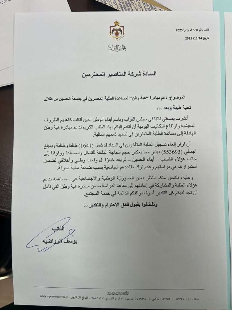 وجّه النائب يوسف الرواضية كتابًا رسميًا إلى مجموعة من الشركات الوطنية الكبرى، من بينها شركة أورنج الأردن، شركة أمنية، شركة مصفاة البترول، مناجم الفوسفات، شركة البوتاس، مجموعة المناصير، والشركة الأردنية لخدمات الهواتف المتنقلة، طالبهم فيه بدعم مبادرة “هبة وطن”، الهادفة إلى مساعدة الطلبة المتعثرين ماليًا في جامعة الحسين بن طلال.
