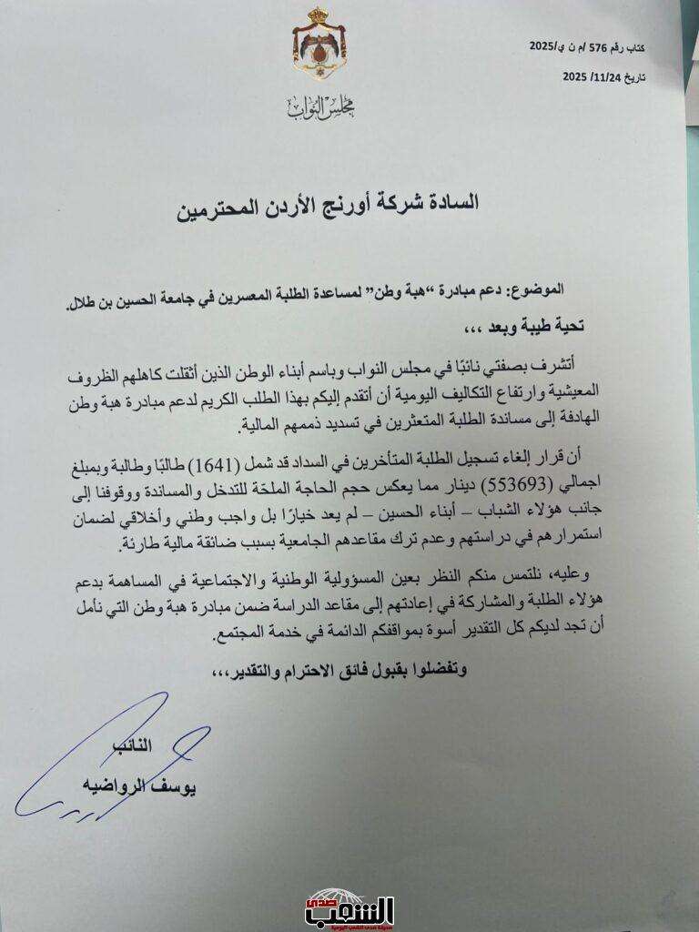 وجّه النائب يوسف الرواضية كتابًا رسميًا إلى مجموعة من الشركات الوطنية الكبرى، من بينها شركة أورنج الأردن، شركة أمنية، شركة مصفاة البترول، مناجم الفوسفات، شركة البوتاس، مجموعة المناصير، والشركة الأردنية لخدمات الهواتف المتنقلة، طالبهم فيه بدعم مبادرة “هبة وطن”، الهادفة إلى مساعدة الطلبة المتعثرين ماليًا في جامعة الحسين بن طلال.