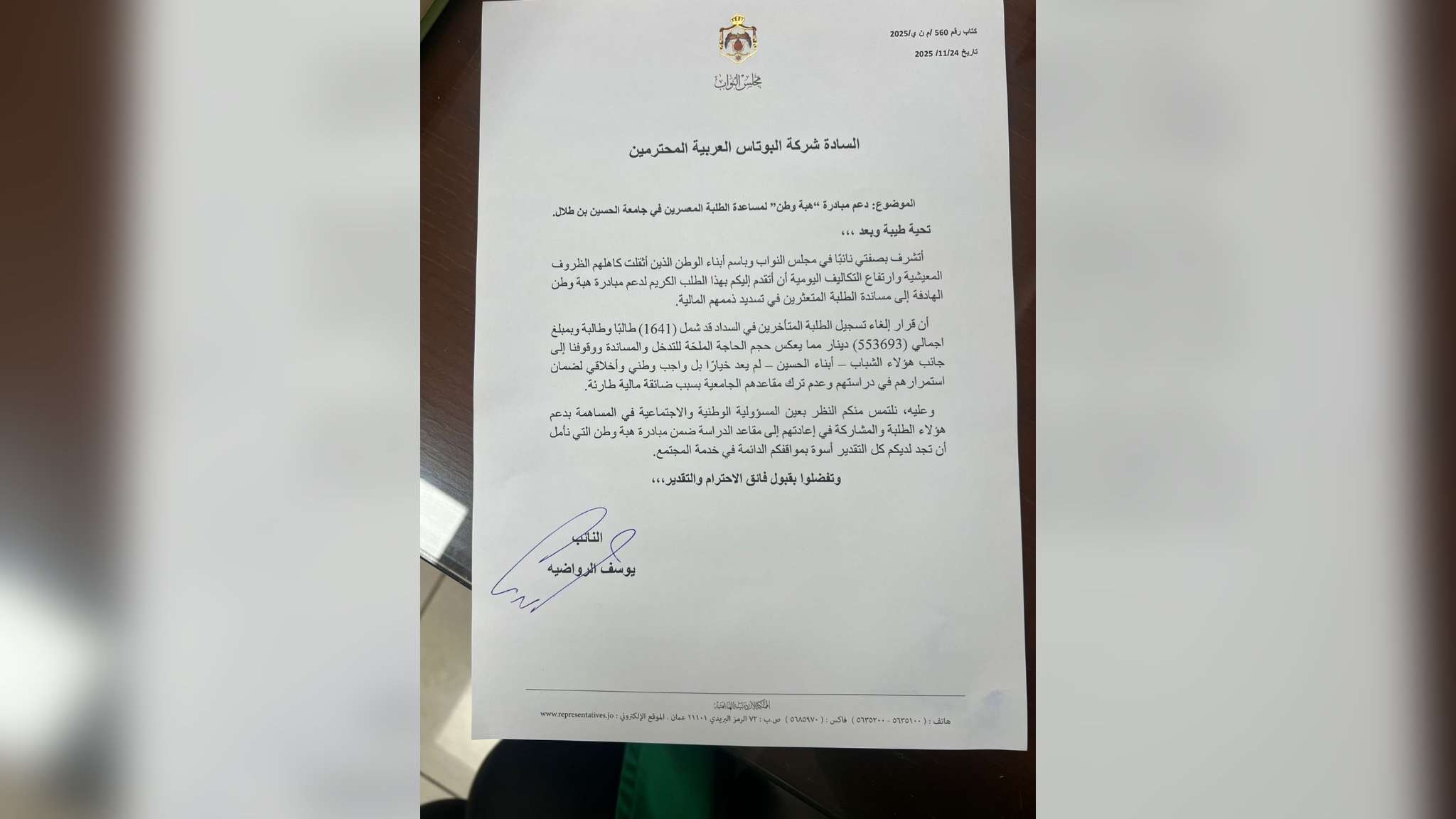 وجاء طلب الرواضية بعد قرار مجلس العمداء رقم (2025/353)، المتعلق بإلغاء تسجيل الطلبة المذمومين ماليًا، والذي شمل 1641 طالبًا وطالبة بمبالغ إجمالية بلغت 553,693 دينارًا.