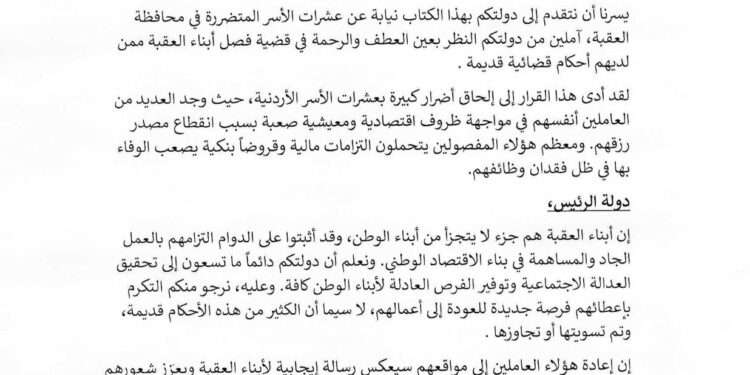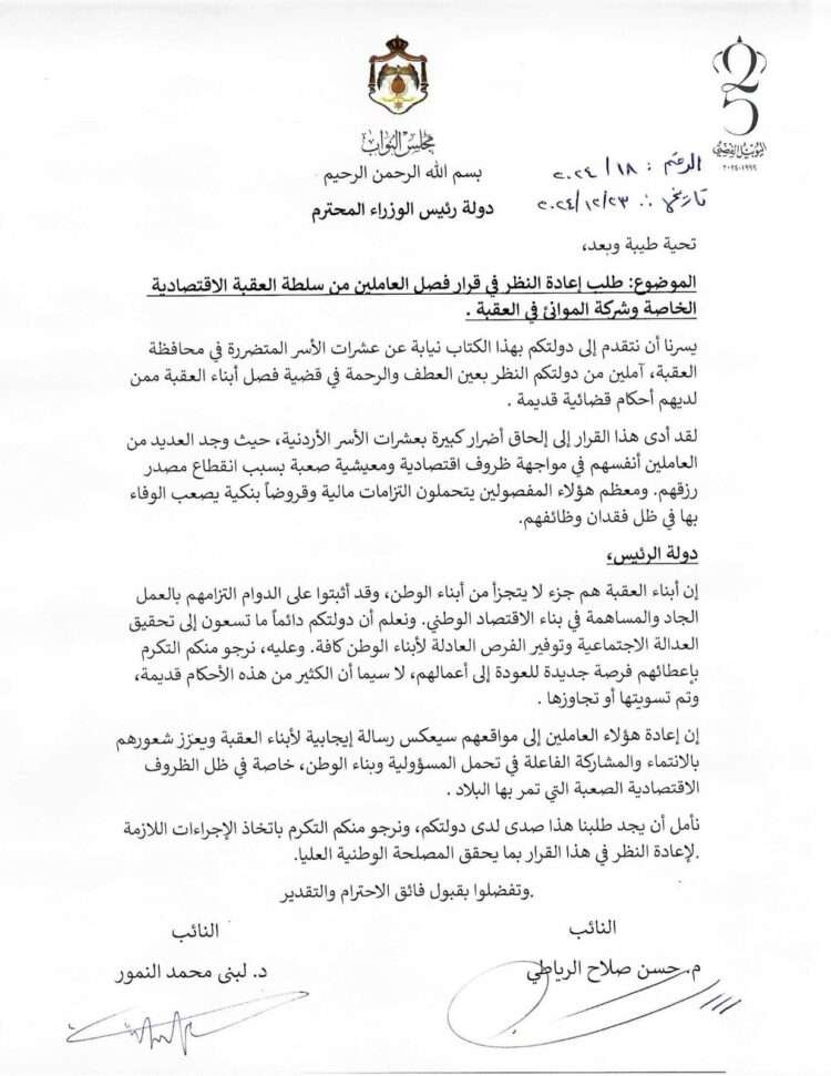 وجه نائبا العقبة حسن الرياطي ولبنى النمور كتابا لدولة رئيس الوزراء طالبا فيه بإعادة النظر بقرار من تم فصلهم من سلطة العقبة الاقتصادية الخاصة وشركة العقبة لإدارة وتشغيل الموانئ