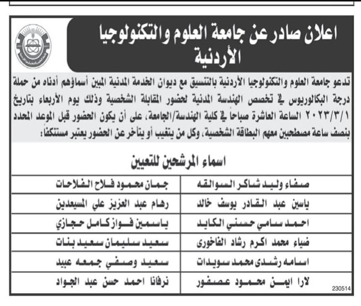 صدى الشعب – دعا ديوان الخدمة المدنية بالتنسيق مع عدد من الوزارات والمؤسسات الحكومية الأشخاص التالية لاستكمال إجراءات التعيين و المقابلات الشخصية.