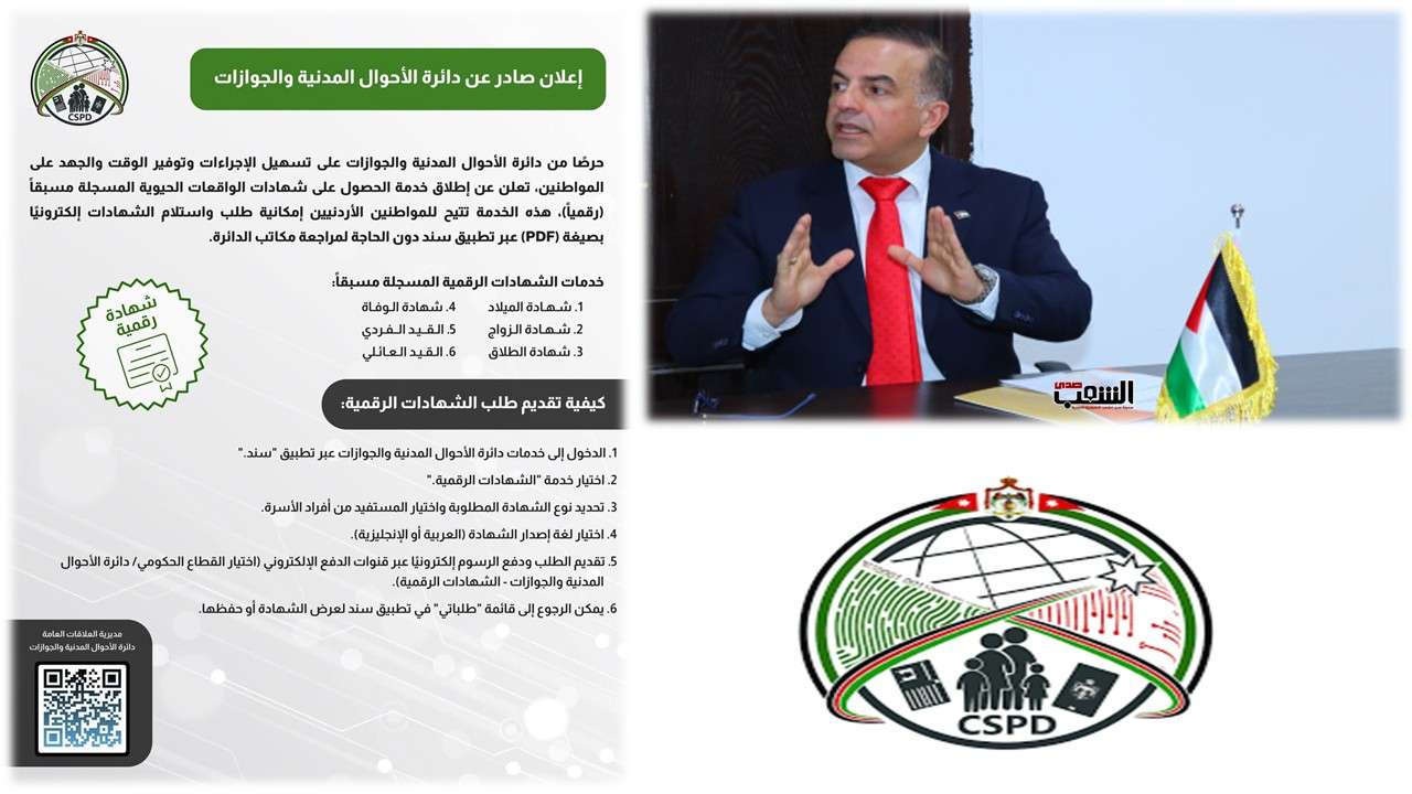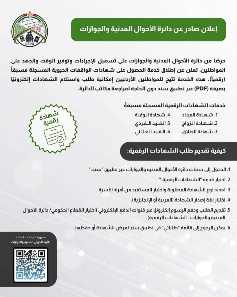 وبين الطيب في رسالة للأردنيين، هذه الخدمة تتيح للأردنيين إمكانية طلب واستلام الشهادات إلكترونيًا بصيغة (PDF) وعبر تطبيق سند دون الحاجة للمراجعة والحضور الشخصي لمكاتب الدائرة.