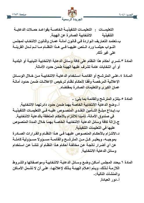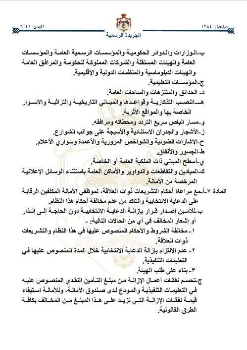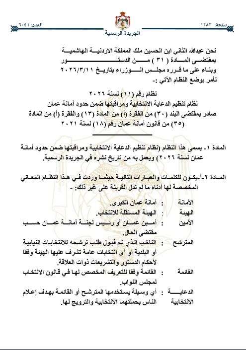 صدى الشعب -صدرت الإرادة الملكية السامية، في عدد الجريدة الرسمية اليوم الخميس بالموافقة على قرار مجلس الوزراء الصادر بتاريخ 11-3-2026، المتضمن وضع نظام تنظيم الدعاية الانتخابية، ومراقبتها ضمن حدود أمانة عمَّان.