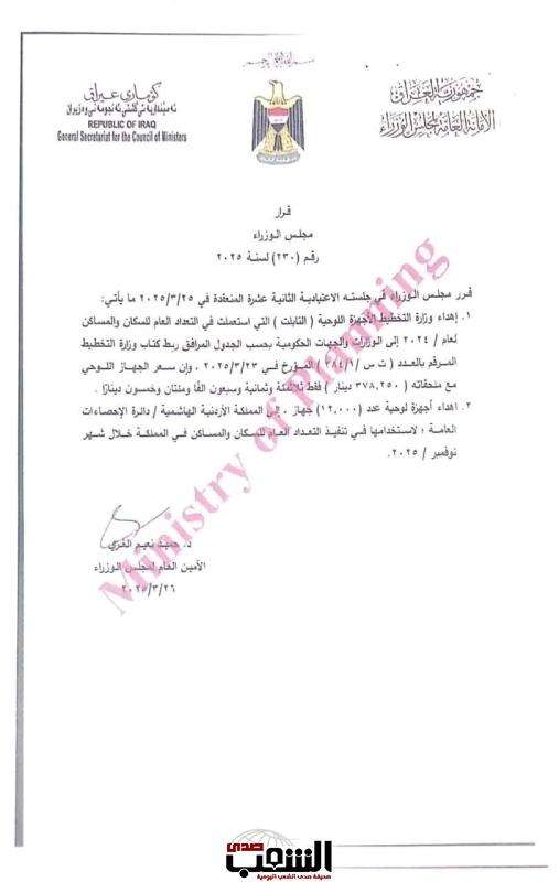 وذكرت الوزارة في بيان لها، أن الجانب الأردني طلب استعارة (12) ألف جهاز لوحي لاستخدامها في تنفيذ التعداد السكاني، غير أن الحكومة العراقية قررت إهداء هذه الأجهزة إلى الأردن، في إطار التعاون الثنائي وتعزيز العلاقات بين البلدين الشقيقين.