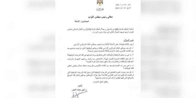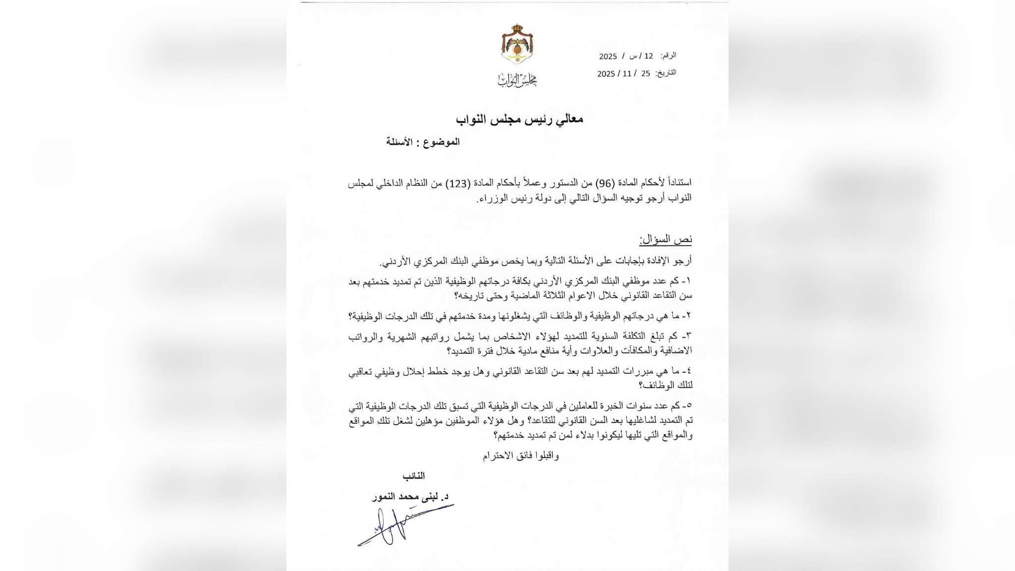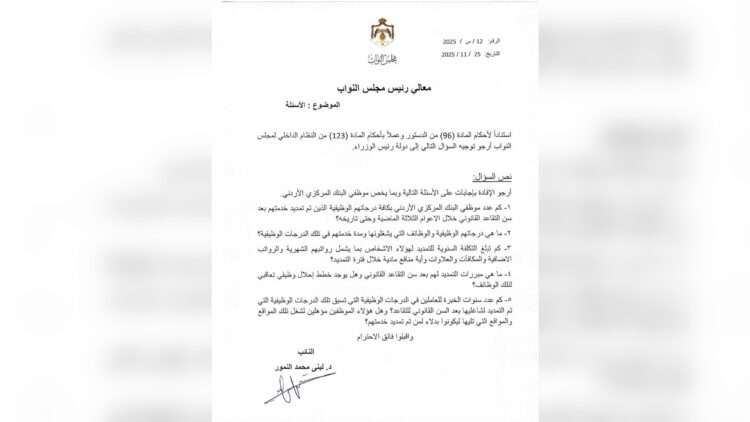 وجهت النائب عن محافظة العقبة لبنى النمور سؤالا نيابيا للحكومة حول التمديد لبعض موظفي البنك المركزي رغم بلوغهم السن القانوني والتقاعد المدني