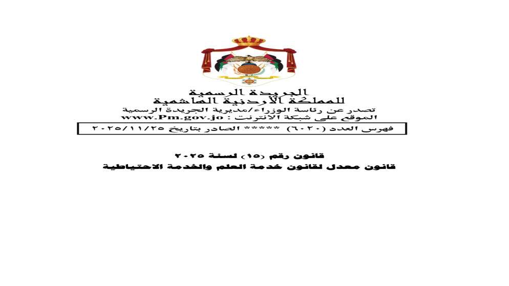صدى الشعب – نشرت الجريدة الرسمية في عدد خاص، القانون المعدل لقانون خدمة العلم والخدمة الاحتياطية، بعد إقراره من مجلسي النواب والأعيان، ليصبح نافذاً من تاريخ نشره.