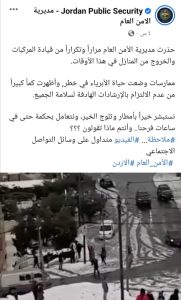 وقالت الصفحة أن مديرية الأمن العام حذرت مراراً وتكراراً من قيادة المركبات والخروج من المنازل في هذه الأوقات، مبينة أن هناك ممارسات وضعت حياة الأبرياء في خطر، وأظهرت كماً كبيراً من عدم الالتزام بالإرشادات الهادفة لسلامة الجميع.