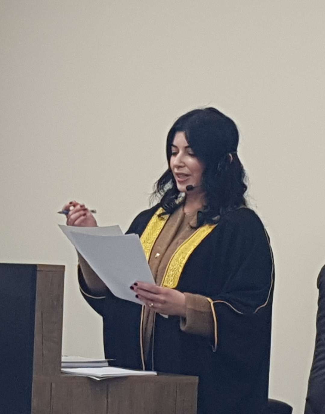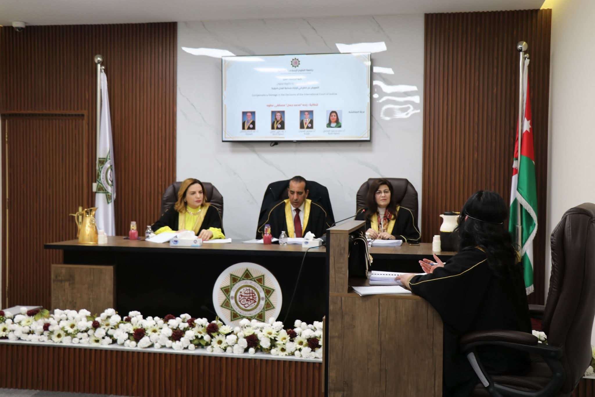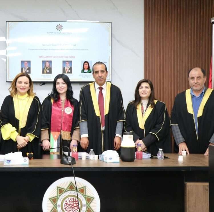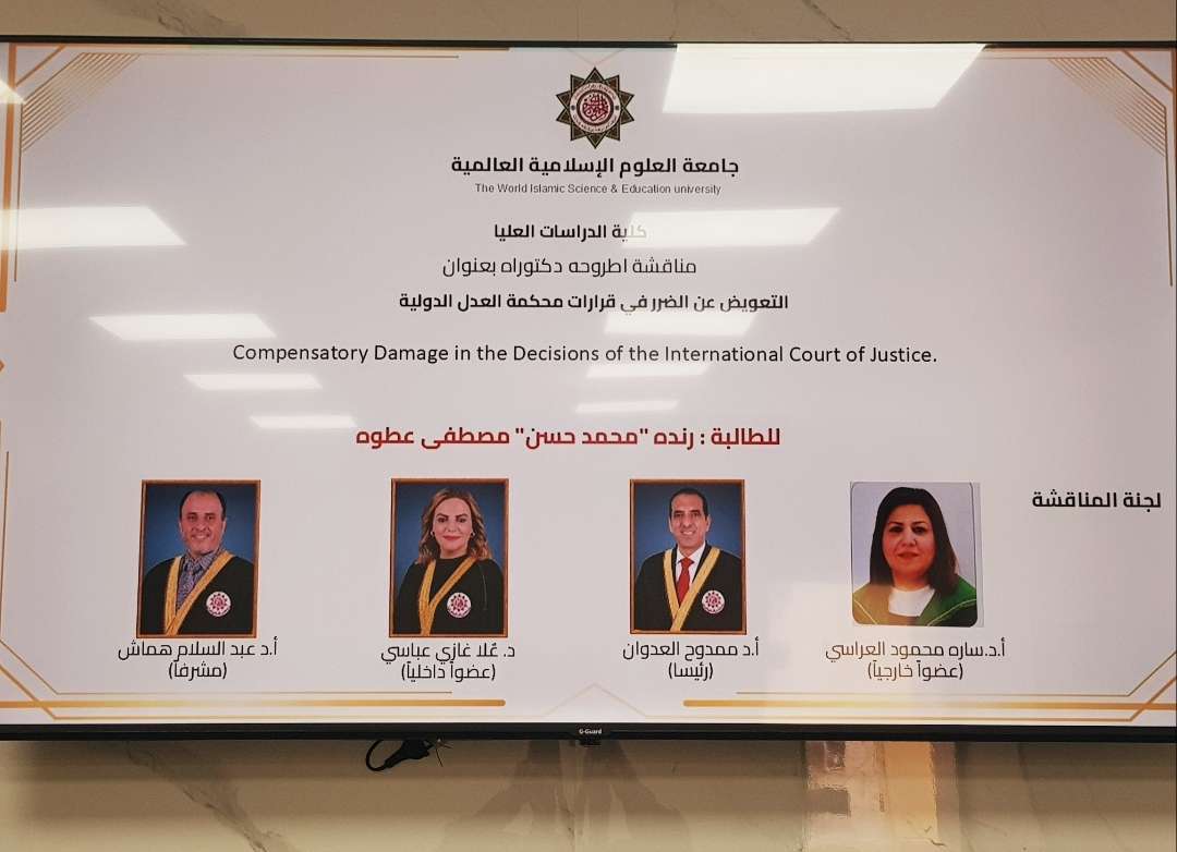 وبعد مناقشة علمية مستفيضة، قررت اللجنة نجاح الباحثة ومنحها درجة الدكتوراه في القانون العام، حيث جرى توشيحها بوشاح الجامعة الخاص بحملة شهادة الدكتوراه.