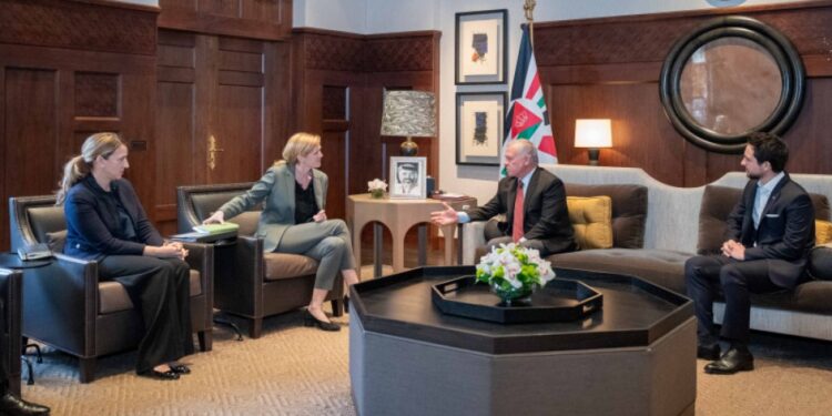 وتناول اللقاء الجهود المكثفة التي يبذلها الأردن لمضاعفة المساعدات الإنسانية إلى غزة وضمان إيصالها واستدامتها، للحد من تفاقم الوضع الإنساني الكارثي في القطاع، إذ أكد جلالته ضرورة تحرك المجتمع الدولي بشكل فوري بهذا الشأن.