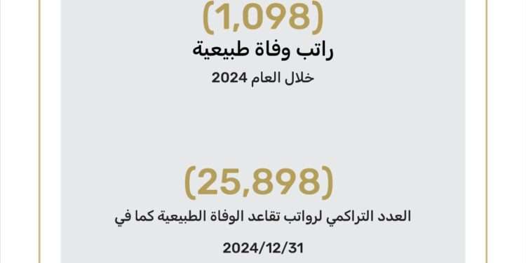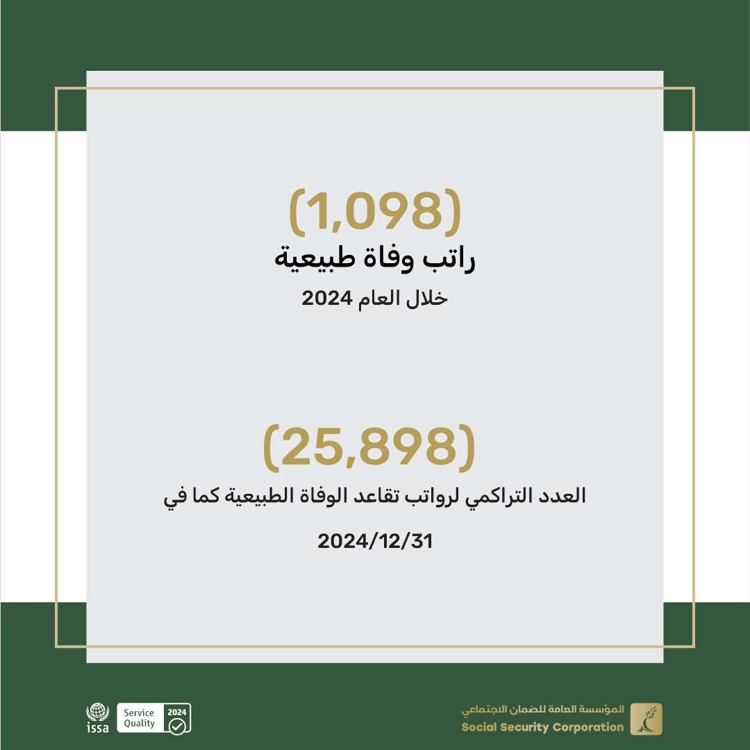 أعلنت المؤسسة العامة للضمان الاجتماعي في بيان صحفي صادر عن مركزها الإعلامي عن تخصيص (1098) راتب وفاة طبيعية خلال العام الماضي 2024، ليصل العدد التراكمي لرواتب تقاعد الوفاة الطبيعية كما في 31/12/2024 إلى (25898) راتباً تقاعدياً.