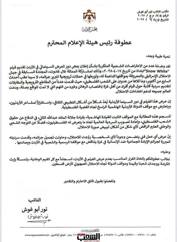 صدى الشعب – وجهت النائب نور أبو غوش سؤالاً نيابياً لهيئة الإعلام و رئيسها عبر الأمانة العامة للمجلس، تسأله فيها عن عرض فيلم “Snow White” في دور السينما الأردنية، اعتباراً من 17 أبريل المقبل، لأن هناك مشاركة لمجندة صهيونية في الفيلم و هي المعروفة بدعمها لجرائم الاحتلال تجاه أهلنا بغزة، إضافة إلى دعمها للرواية الكاذبة لمعركة العبور البطلة للاراضي المحتلة من قبل المقاومة في 7 أكتوبر المجيد، تالياً السؤال:
