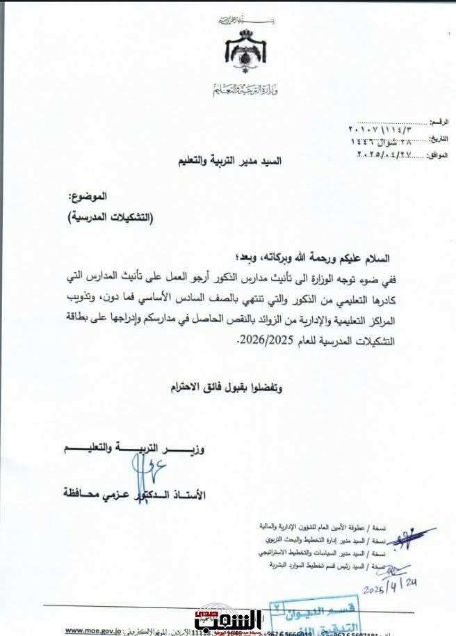 ووفقاً لكتاب وزير التربية والتعليم، يأتي ذلك في ضوء توجه الوزارة إلى تأنيث مدارس الذكور.