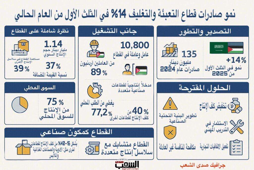 وذكر أن القطاع حقق نمواً بنسبة 9% ضمن مؤشر الصناعة الأردنية خلال الربع الأول من العام 2025، بزيادة قدرها 0.5% مقارنة مع نفس الفترة من عام 2024، وهي أعلى نسبة نمو يسجلها المؤشر خلال السنوات الخمس الماضية، ما يعكس تطور القطاع وزيادة مساهمته في النمو الصناعي العام.