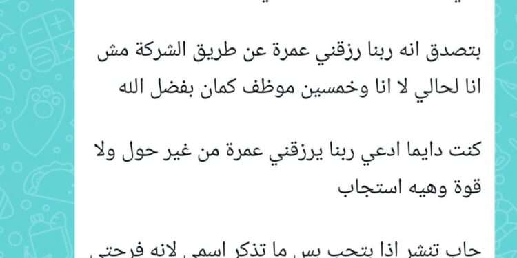 وأضاف أن الشركة أبلغته مؤخرا باختياره ضمن مجموعة من الموظفين لأداء العمرة على نفقتها، قائلا؛ مش بس أنا، خمسين موظف كمان راح يروحوا معنا، والله فرحتي ما بتنوصف، شباب الشركة برفعوا الراس، وربنا يبارك فيهم ويرزقهم.”