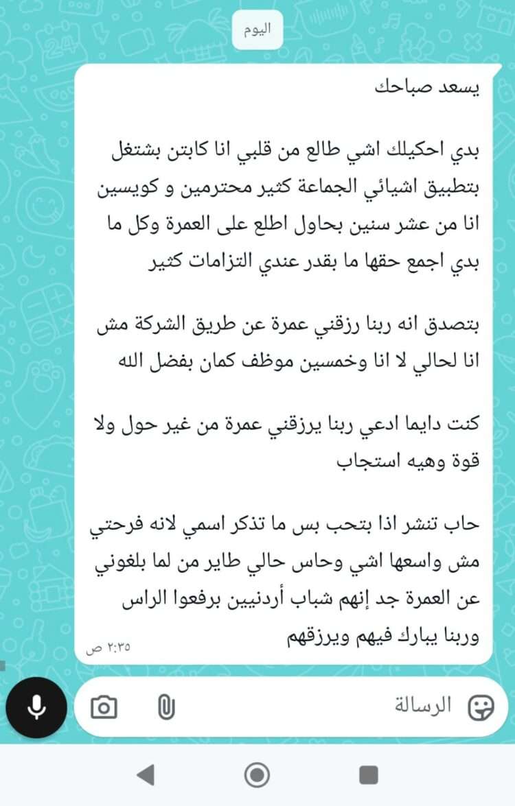 وأضاف أن الشركة أبلغته مؤخرا باختياره ضمن مجموعة من الموظفين لأداء العمرة على نفقتها، قائلا؛ مش بس أنا، خمسين موظف كمان راح يروحوا معنا، والله فرحتي ما بتنوصف، شباب الشركة برفعوا الراس، وربنا يبارك فيهم ويرزقهم.”