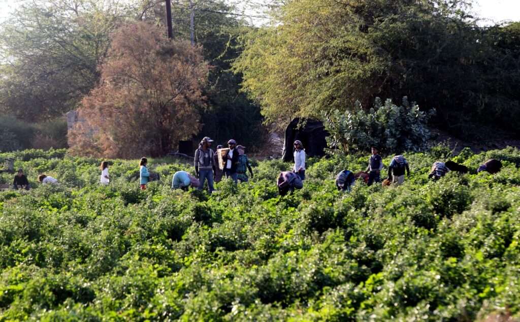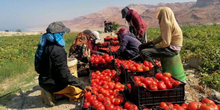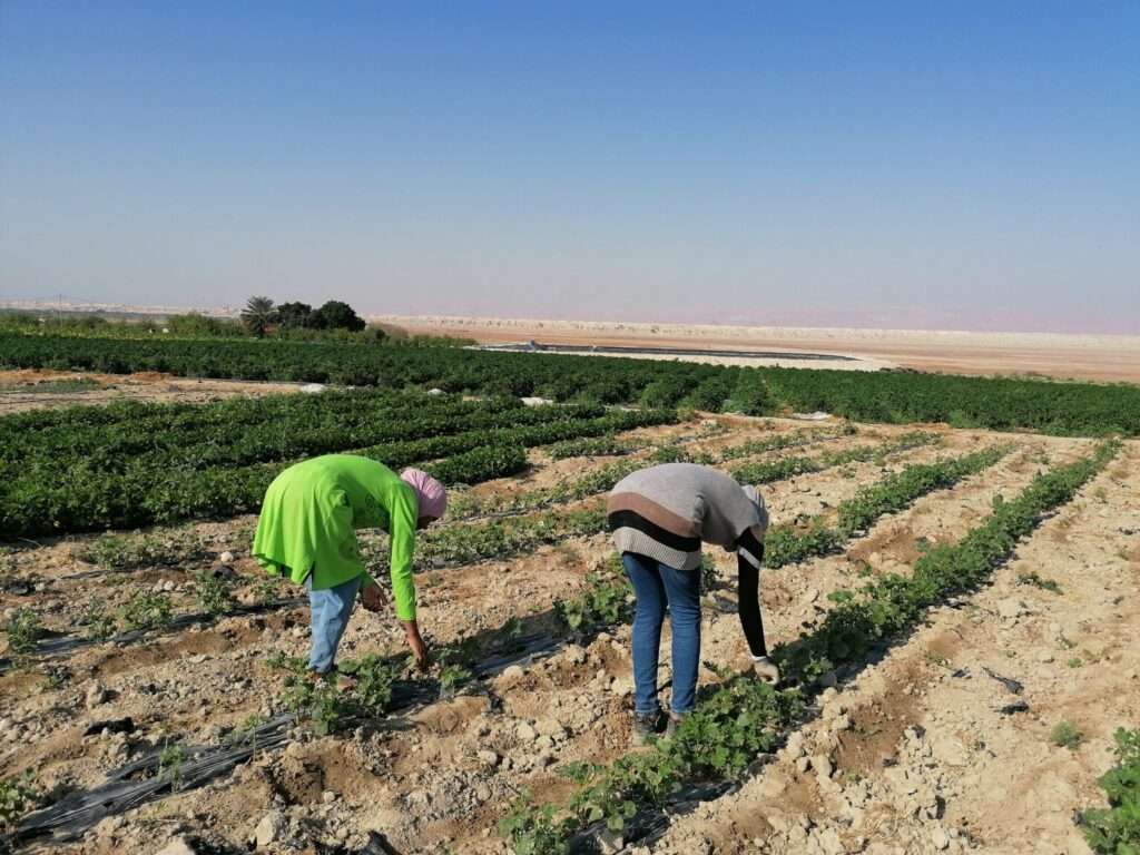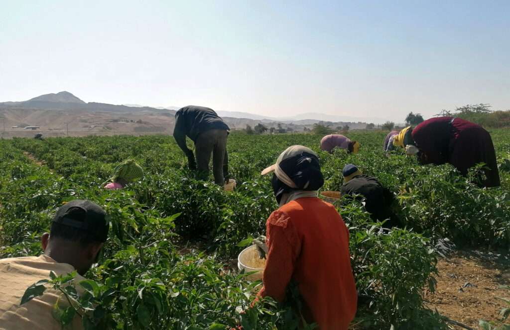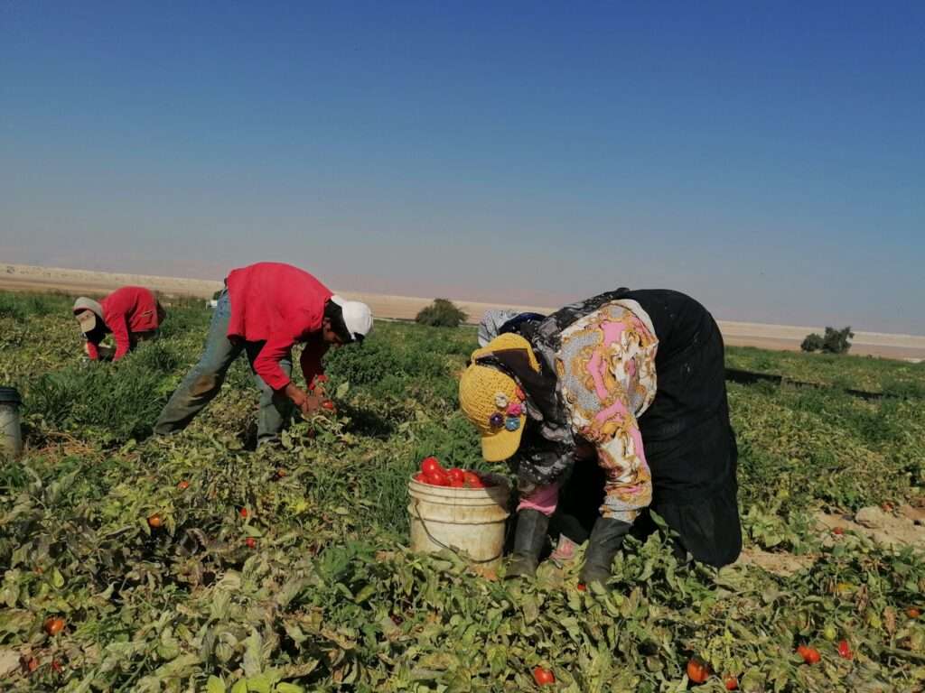 الشمس تتوسط السماء، وتصب لهيبها على رؤوس العاملين في قطاف محصول الأرض المكشوفة تمامًا في إحدى القطع الزراعية في غور الحديثة التابعة للواء الأغوار الجنوبية بمحافظة الكرك.
