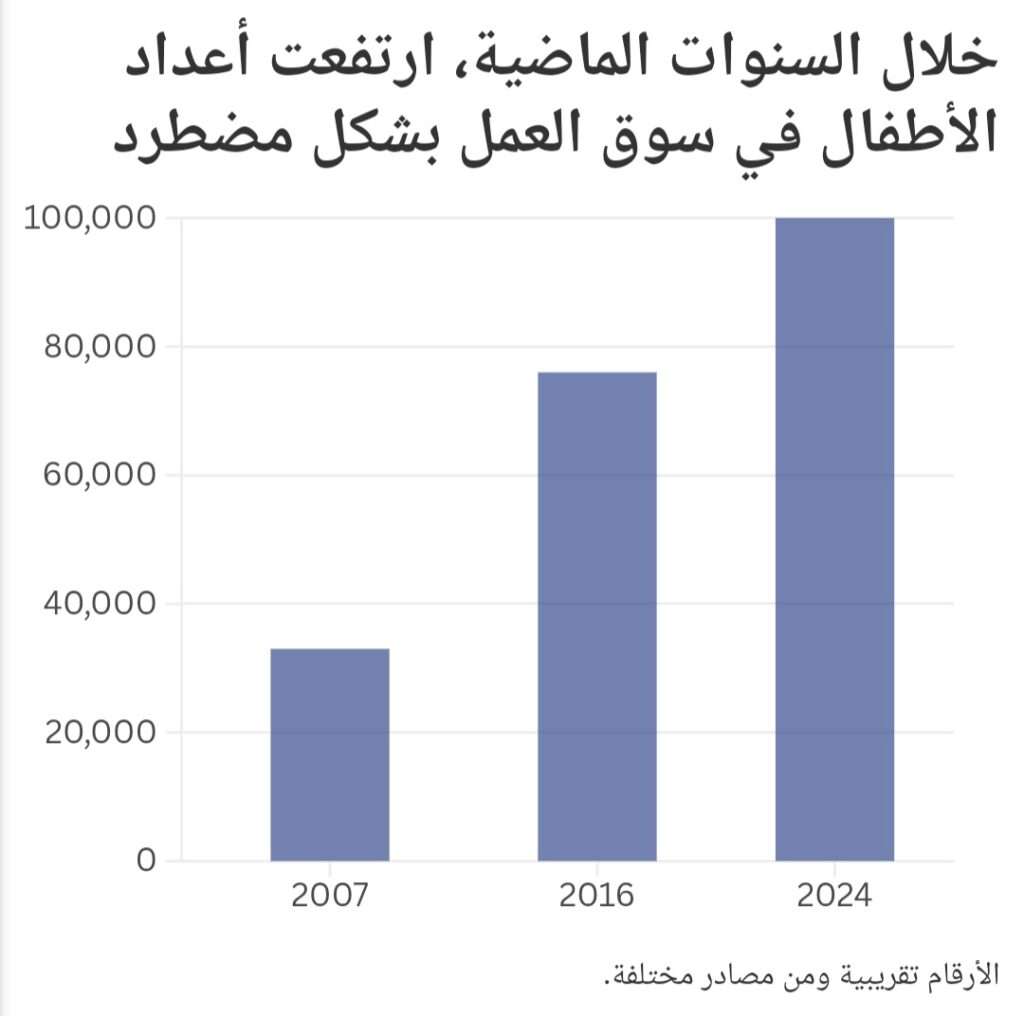 تشير تقديرات بيت العمال إلى أن عدد الأطفال في سوق العمل بلغ أكثر من 100 ألف طفل، بزيادة حوالي 25 ألفًا، عن آخر إحصاء رسمي، والذي كان في العام 2016. ومن بين هؤلاء، يشير بيت العمال إلى أن حوالي 60 ألفًا يعملون في بيئات عمل خطرة.