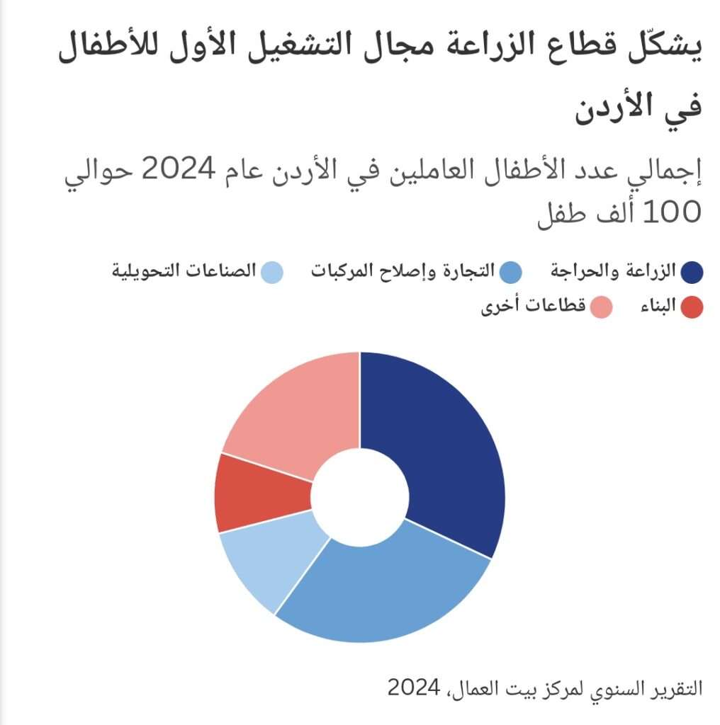 يستقطب القطاع الزراعي نحو 32% من الأطفال العاملين عمومًا، وفقا لتقرير للمركز الأردني لحقوق العمل «بيت العمال» صدر منتصف عام 2024. فيما تشير نتائج المسح الوطني لعمالة الأطفال عام 2016 إلى أن 56% من عمالة الأطفال بين سني 5-11 عامًا تتجه إلى القطاع الزراعي تحديدًا، بينما يتجه من هم بين سني 15-17 عامًا إلى مهن أخرى بنسب أعلى.