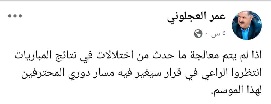 وقال العجلوني في تصريحه: “إذا لم يتم معالجة ما حدث من اختلالات في نتائج المباريات، انتظروا الراعي في قرار سيغير فيه مسار دوري المحترفين لهذا الموسم.”