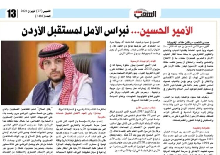 الأمير الحسين ، منذ أن تم تعيينه ولياً للعهد أظهر اهتماماً بالغاً بقضايا الشباب والتعليم والتطوير التكنولوجي ، مُظهراً نقاط قوة كثيرة تبشر بقيادة مستقبلية فاعلة ومتجددة يُعتبر محط أنظار الشباب الأردني كنموذج يحتذى به في الانفتاح والتسامح والجدّ في التعليم ، وقد استطاع أن يحجز لنفسه مكانة خاصة في قلوب الأردنيين بالرغم من صغر سنه ، فإن الأمير الحسين يحمل على عاتقه مسؤوليات جسام ، ويبذل جهودًا مضنية ليكون جسرًا للتواصل بين الأجيال وليعزز من مكانة الأردن على الساحة الدولية ، لديه بصيرة نافذة وحنكة سياسية وعسكرية اكتسبها من والده جلالة الملك عبدلله الثاني بن الحسين .