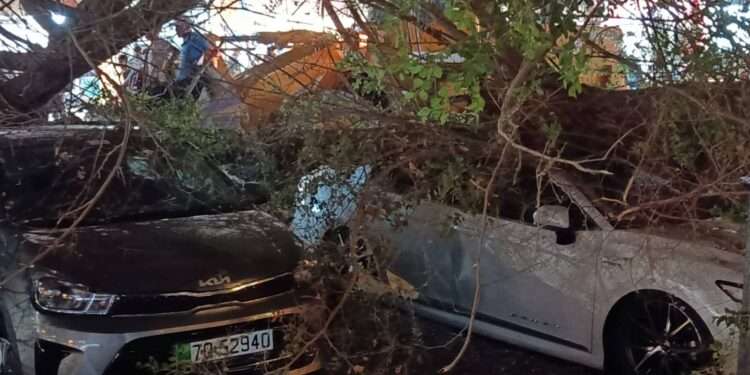 تسبب سقوط شجرة معمرة بشارع البيتزا بالعقبة بوقوع بعض الأضرار لبعض المركبات المصطفة في تلك المنطقة دون وقوع إصابات بشرية