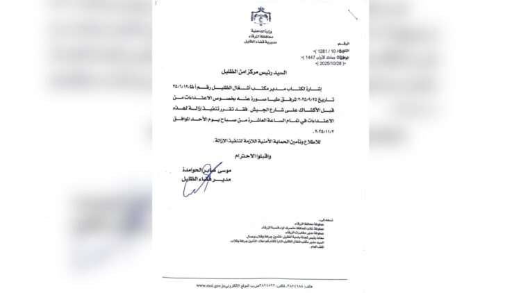 قرر مدير قضاء الظليل، موسى الحوامدة، تنفيذ حملة لإزالة الاعتداءات التي تتمثل بوجود أكشاك في شارع الجيش، منطقة الظليل، وذلك صباح يوم الأحد المقبل، الثاني من تشرين ثاني، 2/11/2025.