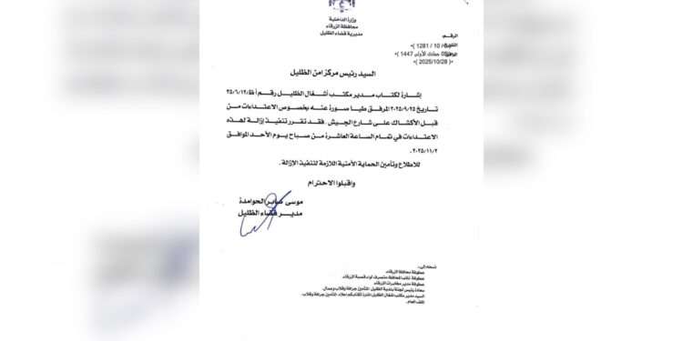 قرر مدير قضاء الظليل، موسى الحوامدة، تنفيذ حملة لإزالة الاعتداءات التي تتمثل بوجود أكشاك في شارع الجيش، منطقة الظليل، وذلك صباح يوم الأحد المقبل، الثاني من تشرين ثاني، 2/11/2025.