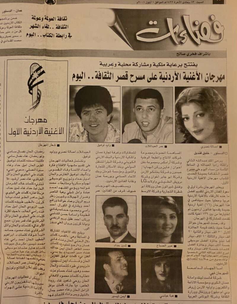 صورة من صحيفة الدستور الأردنيّة 2/9/2001 مشاركة في الدورة الأولى لمهرجان الأغنية الأردنية – برعاية ملكية سامية