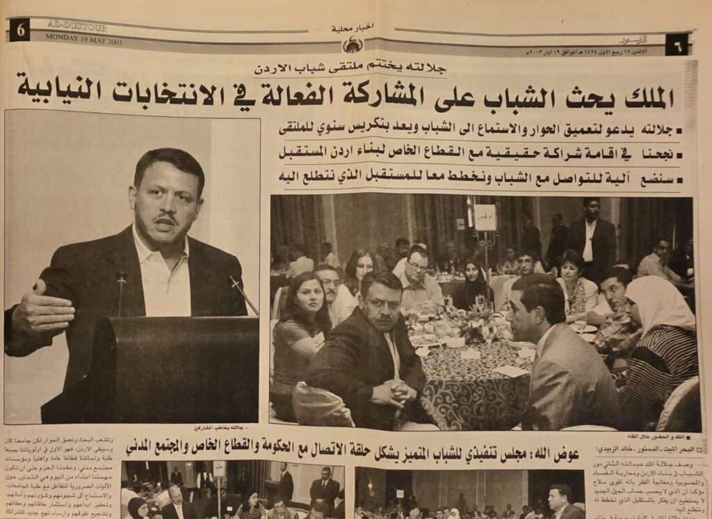 في مطلع الألفيّة الجديدة، وتحديدًا عام 2003، أُتيحَ لي شرف المشاركة في الملتقى الوطنيّ الأوّل لشباب الأردنّ، الذي عُقد في البحر الميت برعاية ملكيّة سامية من جلالة الملك عبدالله الثاني، وبحضور وزراء ونوّاب وأعيان وصنّاع قرار، حيث جمع الملتقى في ذلك الوقت، نخبة من شباب وشابّات الوطن في حوار مباشر مع القيادة السياسية.
