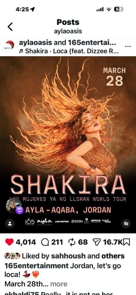 صدى الشعب – تستعد مدينة العقبة لاحتضان حدث فني عالمي غير مسبوق، مع إعلان إقامة حفل ضخم تحييه النجمة العالمية شاكيرا يوم 28 آذار، ضمن جولتها العالمية، في خطوة تُعد من أبرز الأحداث الفنية التي يشهدها الأردن، بمعنى أن الحفلة ستقام بعد رمضان ولن (تُرمضن) معنا و وربما يعتبر حضورها متواصل لأيام العيد، عيد الفطر، حيث من المتوقع أن تكون أيام عيد الفطر السعيد (بين 20-23-3-2026).