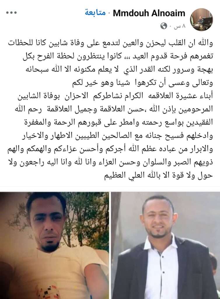 صدى الشعب – اتشحت مواقع التواصل الاجتماعي الأردنية بالسواد حزناً على وفاة الشابين حسن العلاقمة وجميل العلاقمة، يوم أمس الجمعة، (28 رمضان 2025)، إثر حادث دهس مؤسف وقع في منطقة دير علا بالأغوار الشمالية.