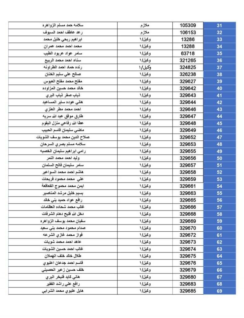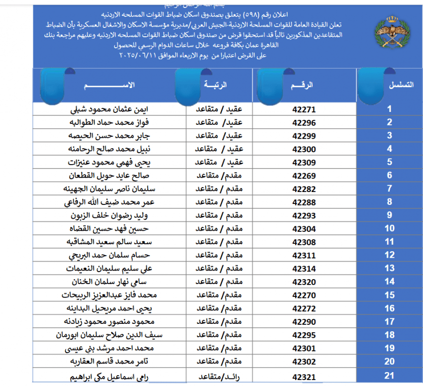 صدى الشعب – أعلنت القيادة العامة للقوات المسلحة الأردنية – الجيش العربي/ مديرية مؤسسة الإسكان والأشغال العسكرية الضباط وضباط الصف والأفراد المبينة أسماءهم أدناه قد استحقوا قرض الإسكان العسكري (الخاص بالأفراد) والضباط المستفيدين من صندوق إسكان الضباط.