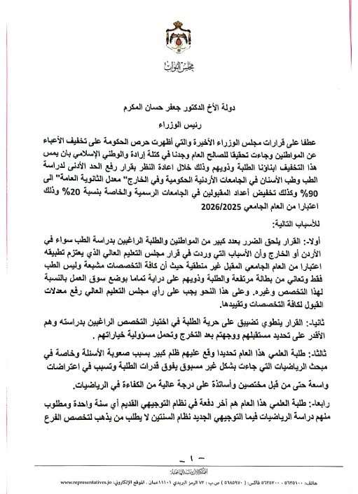 واستناداً الى ما تقدم ولأنصاف طلبة الثانوية العامة هذا ولعدم التأثير على الجامعات الحكومية والخاصة وللحد من الآثار النفسية التي لحقت بالطلبة نؤكد أهمية الغاء قرار رفع الحد الأدنى لدراسة الطب في الأردن وخارجه وعلى الأقل تأجيله للعام المقبل مع نظام التوجيهي السنتين، الذي لا يشترط دراسة الرياضيات ومواد صعبة أخرى ليست ذات علاقة بالمجال، إضافة إلى إلغاء تخفيض أعداد المقبولين في الجامعات الحكومية لتخصصات الطب وطب الأسنان.