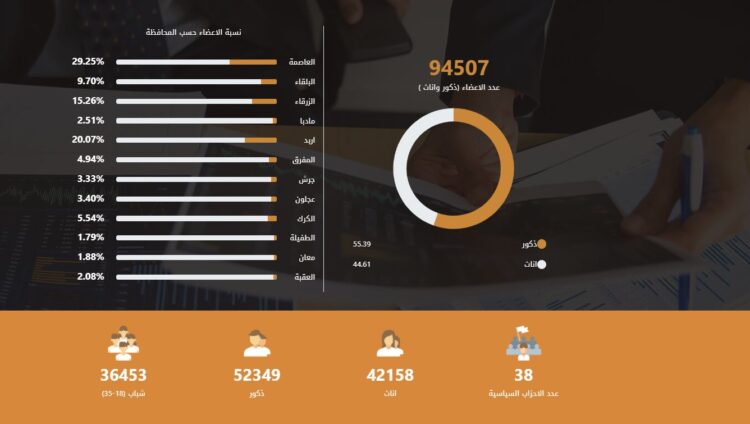 صدى الشعب – بلغ العدد الكلي للمنتسبين والمؤسسين للأحزاب القائمة في المملكة 94502، منهم 55.4% ذكور مقابل 44.6% إناث، موزعين على 38 حزبا سياسيا.