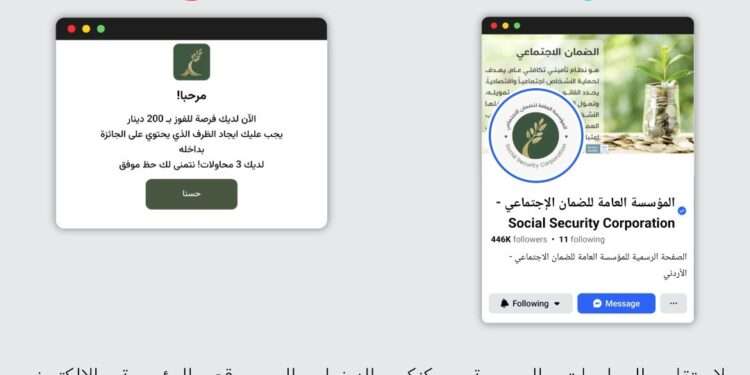 ونفت المؤسسة في بيان صادر عن مركزها الإعلامي ما يتم تكرار تداوله عبر مواقع التواصل الاجتماعي حول الحصول على مبالغ مالية أو جوائز بقيمة (200) دينار من خلال التسجيل في تلك المواقع وطلب بيانات شخصية تهدف إلى تضليل واستغلال جمهورها من مواطنين ومؤمن عليهم.
