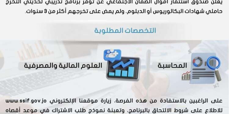 صدى الشعب – أعلن صندوق استثمار أموال الضمان الاجتماعي عن توفر برنامج تدريبي لحديثي التخرج حاملي شهادات البكالوريوس أو الدبلوم، ولم يمض على تخرجهم أكثر من 3 سنوات.