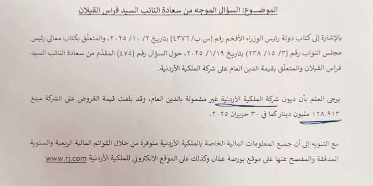 • الملكية الأردنية: 129 مليون دينار دين عام.