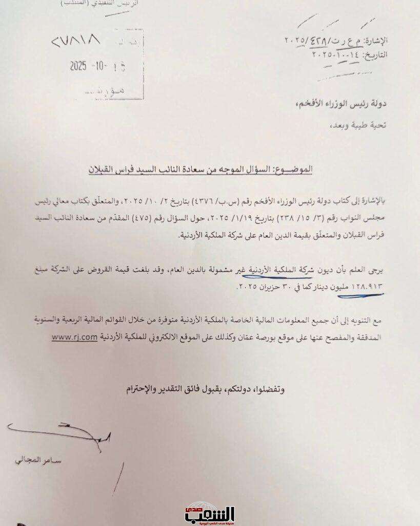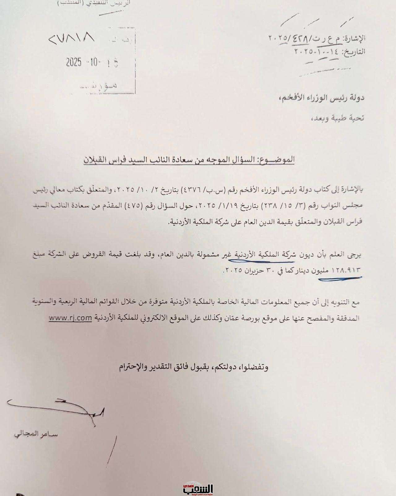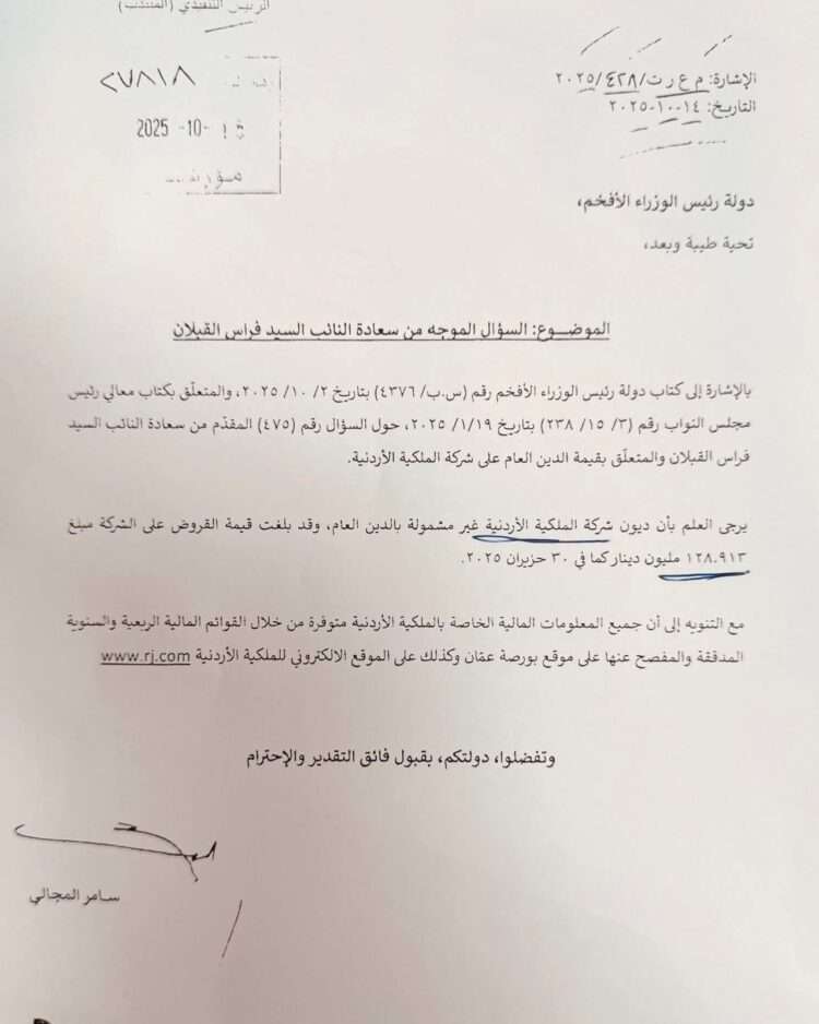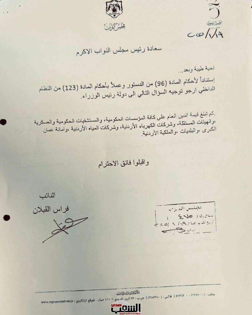 وقال القبلان في تصريح له إن السؤال النيابي رقم (475) وُجّه بتاريخ 19 كانون الثاني 2025 إلى دولة رئيس الوزراء، إلا أن الرد الحكومي ورد مؤخرًا من أربع جهات فقط، فيما لم تجب بقية المؤسسات حتى الآن.