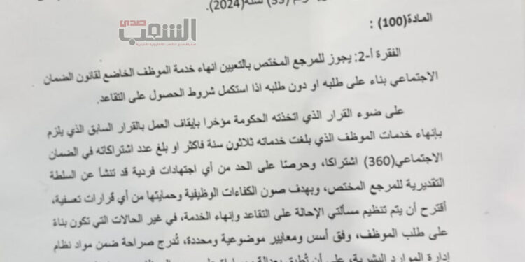 والمتعلق باختصاص و صلاحية من يخول له إنهاء خدمات الموظفين بعد إلغاء القرار الحكومي بإنهاء خدمات من بلغ الـ30 سنة خدمة أو اكثر أو انطبقت عليه شروط تقاعد الضمان.