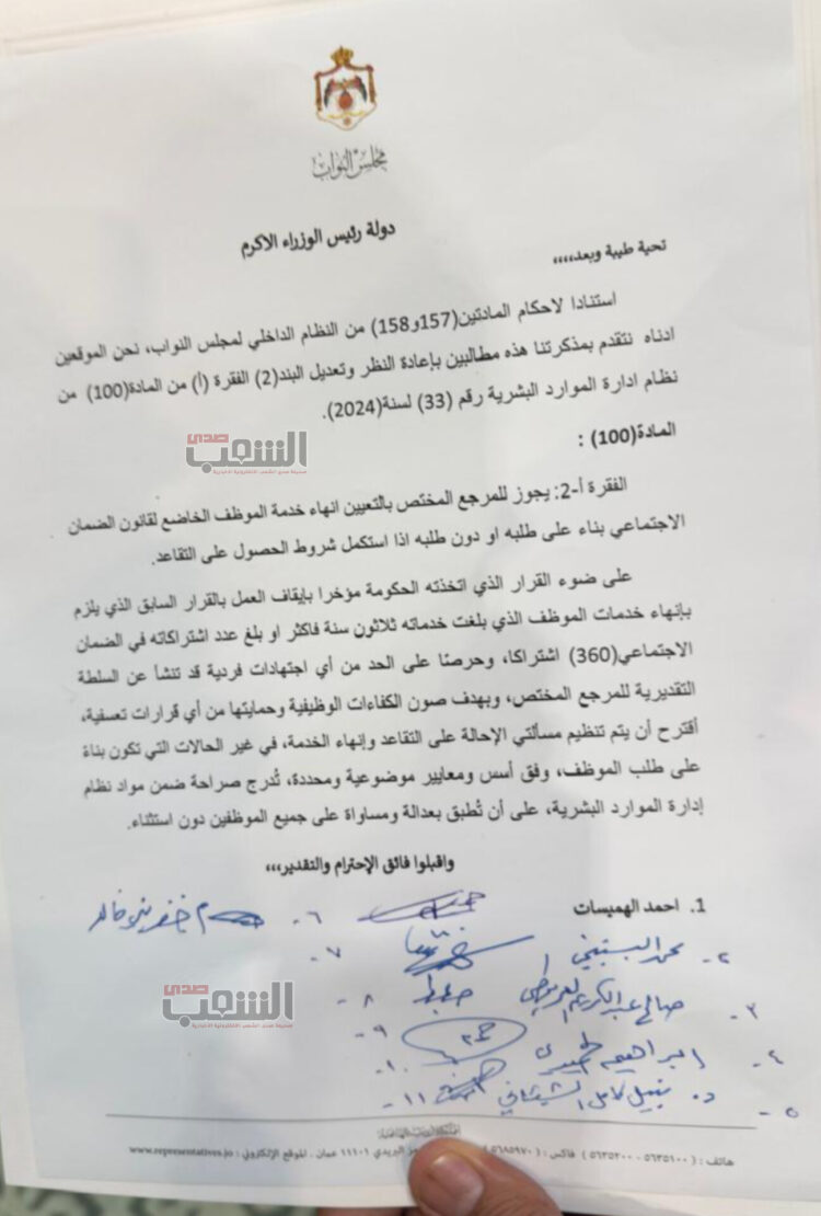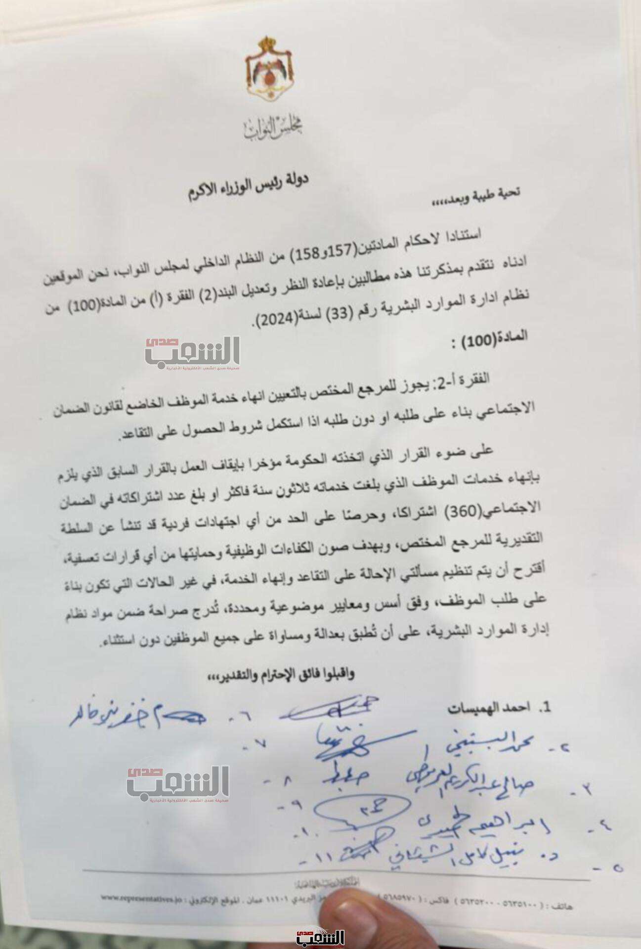 تبنى النائب أحمد هميسات اليوم الإثنين مذكرة نيابية طالب فيها الحكومة من خلال رئيس مجلس النواب، بتعديل البند 2 من الفقرة أ من المادة (100) من نظام إدارة الموارد البشرية رقم (33) لسنة 2024.