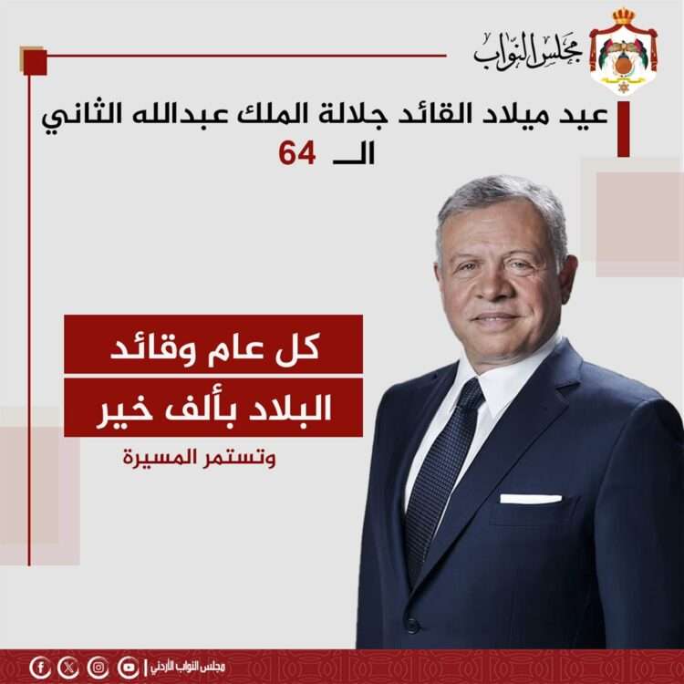صدى الشعب – رفع رئيس مجلس النواب، مازن القاضي، باسمه وأعضاء مجلس النواب، أسمى آيات التهنئة والتبريك إلى مقام حضرة صاحب الجلالة الهاشمية الملك عبد الله الثاني ابن الحسين المعظم، بمناسبة ذكرى ميلاده الميمون، معربًا عن خالص الدعاء بأن يحفظ المولى جلالته ويديم عليه موفور الصحة والعافية، وأن يبقيه سندًا وذخرًا للأردن والأردنيين.