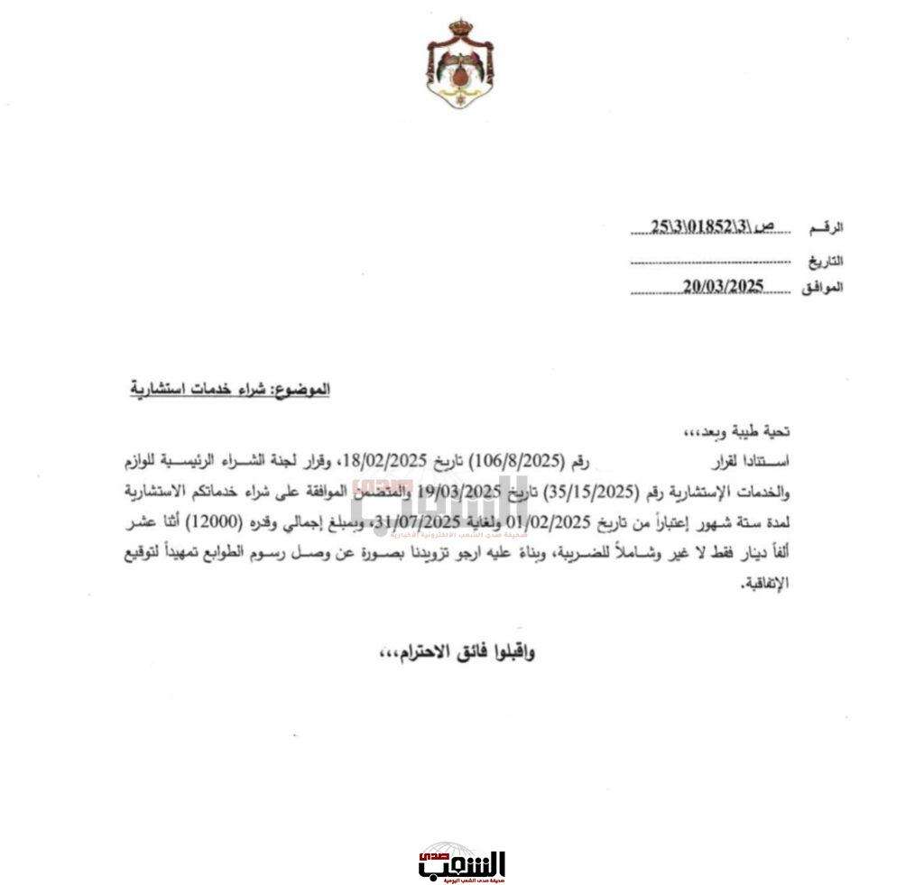 العصفورة أشارت أن هذا القرار جاء بطلب من رئيس المؤسسة مطالباً الحكومة بالإيعاز لمن يلزم بالموافقة رغم أن القرار أتخذ من قبل الرئيس بحسب الوثيقة التي حصلت عليها (صدى الشعب) إلا أن الكتاب يطلب شراء خدمات المستشار اعتباراً من 1-2- 2025 الماضي و حتى 31 -7-2025، فيما يحمل تاريخ 20-3-2025، و السؤال هنا، لماذا تأخر القرار قرابة الشهرين.. تسأل العصفورة و تستفسر ما الذي كان يمنع ؟