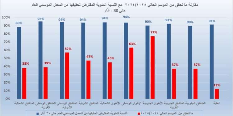 وأشارت إدارة الأرصاد الجوية إلى أن الرسم البياني المرفق يوضح النسب المحققة من الموسم المطري العام في مختلف مناطق المملكة حتى صباح يوم 30 آذار 2025.