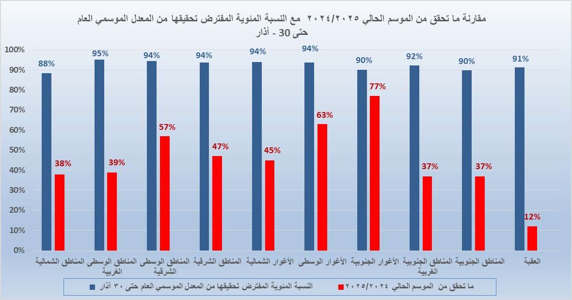 وأشارت إدارة الأرصاد الجوية إلى أن الرسم البياني المرفق يوضح النسب المحققة من الموسم المطري العام في مختلف مناطق المملكة حتى صباح يوم 30 آذار 2025.
