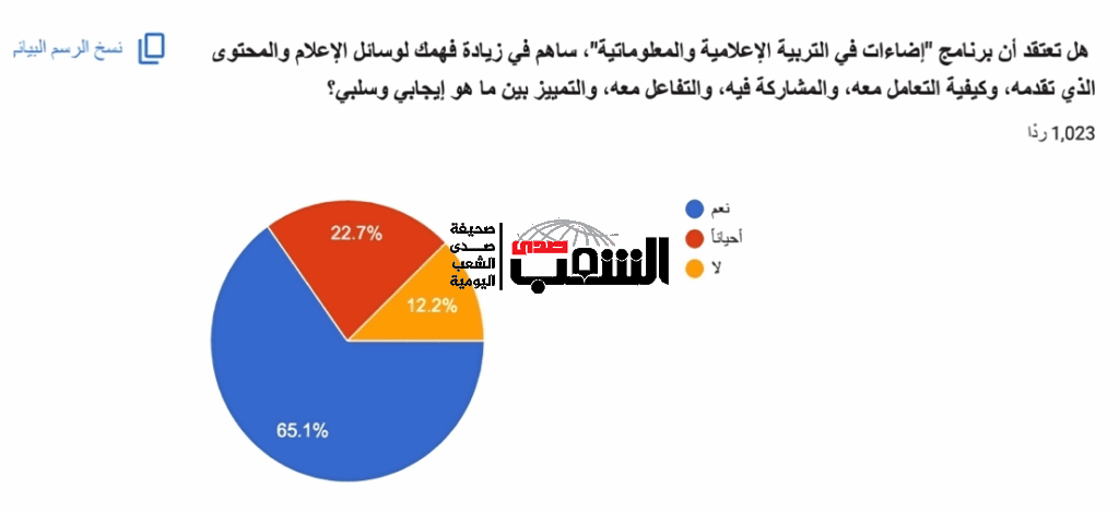 وبيّنت العوايشة أن الاستبيان، الذي شارك فيه 1023 مشاركاً، أظهر أن 65.1% أكدوا أن البرنامج أسهم في زيادة فهمهم لوسائل الإعلام والمحتوى الذي تقدمه، وكيفية التعامل معه والتمييز بين الإيجابي والسلبي، فيما أشار 22.7% إلى أن الاستفادة كانت “أحيانًا”، مقابل 12.2% لم يلمسوا أثراً واضحاً.