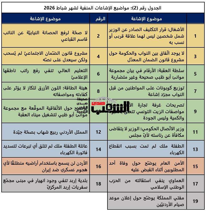 وفي هذا السياق أوضحت رئيس قسم الأجندة الإعلامية الحكومية في وزارة الاتصال الحكومي، هيا العوايشة، إن الوزارة لا تمارس دوراً رقابياً مباشراً على وسائل الإعلام أو منصات التواصل الاجتماعي، بل تعتمد على فرق متخصصة في الرصد الإعلامي تعمل ضمن مؤسسات الإعلام الحكومي، وتتابع بشكل يومي ومنهجي ما يُنشر محلياً ودولياً.
