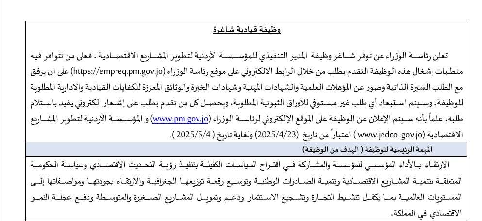 وسيتم الإعلان عن الوظيفة على الموقع الإلكتروني لرئاسة الوزراء (www.pm.gov.jo) و المؤسسة الأردنية لتطوير المشاريع الاقتصادية (www.jedco .gov.jo) اعتباراً من تاريخ  (23/4/2025) ولغاية تاريخ ( 4/5/2025 ).