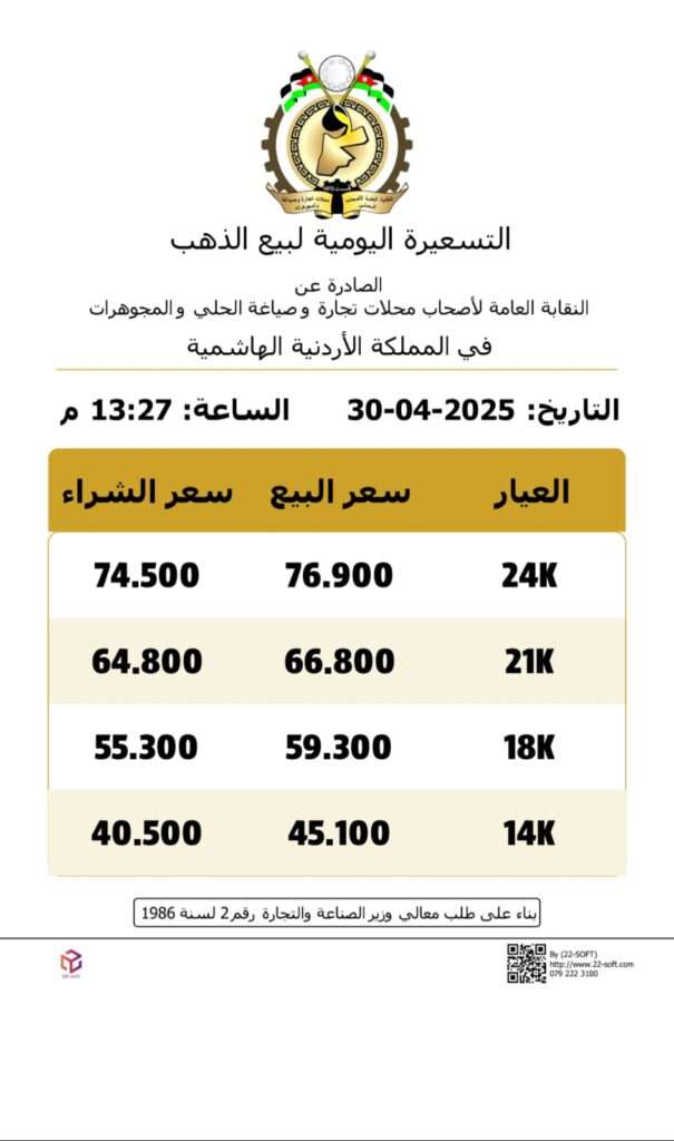 صدى الشعب - انخفضت أسعار الذهب اليوم الأربعاء (30-4-2025) في الأردن في التسعيرة المسائية، 6 قرشاً. وبحسب التسعيرة ، بلغ سعر بيع غرام الذهب عيار 21 الأكثر رغبة من المواطنين 66.8 ديناراً لغايات البيع من محلات الصاغة مقابل 64.8 ديناراً لجهة الشراء.