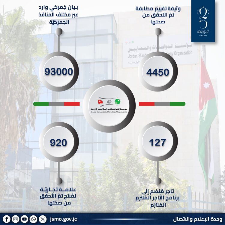 صدى الشعب – أعلنت مؤسسة المواصفات والمقاييس أنها تعاملت خلال النصف الأول من العام مع (93000) بيان جمركي وارد عبر مختلف المنافذ الجمركيّة، حيث يتواجد موظفو المؤسسة على المعابر الحدودية للتأكد من مطابقة السلع والمنتجات الواردة إلى المملكة للمواصفات القياسيّة والقواعد الفنيّة والتعليمات الناظمة، قبل السّماح بدخولها الأسواق، وذلك في إطار سعي المؤسسة لتوفير الحماية الصحية والبيئية والسلامة العامة ودعم الاقتصاد الوطني.