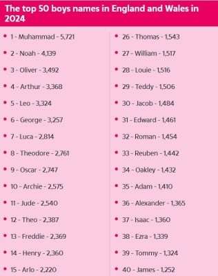 وذكرت الصحيفة أن أزيد من 5721 طفلاً أطلق عليهم اسم “محمد” في عام 2024، فيما احتل “Noah” المركز الثاني بـ4139 طفلاً.